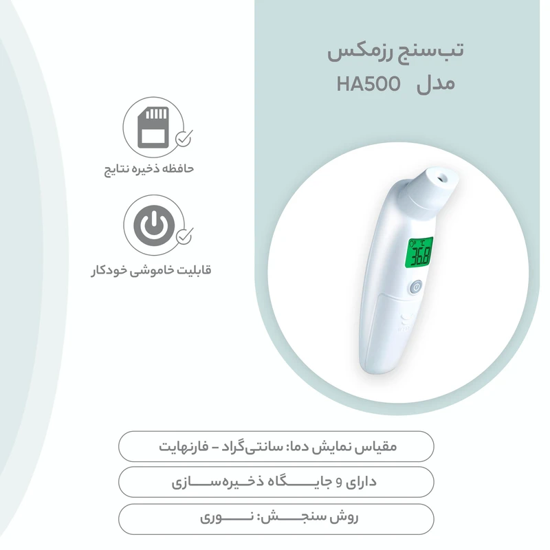 تبسنج را میتوان یکی از لوازم اولیهی پزشکی و جزو لوازم کمکهای اولیه در نظر گرفت. خصوصا اگر در خانه، کودک کم سن و سال وجود داشته باشد، تبسنج میتواند هنگام بیماری به والدین کمک کند تا فرآیند بهبودی فرزندشان را زیر نظر داشته باشند یا برای تشخیص بیماری از آن استفاده کنند. تبسنج رزمکس (Rossmax) مدل HA500، با قابلیتهای خوبی که دارد میتواند گزینهی مناسبی باشد. این تبسنج از نوع دیجیتال است و از سنجش نوری برای اندازهگیری دما استفاده میکند. قابلیت اندازهگیری دمای پیشانی در فاصلهی 5 سانتیمتری یکی از قابلیتهای این دستگاه است که برای گرفتن تب بیمار بسیار کاربردی است. این تبسنج ظرف مدت 1 ثانیه دمای بدن را اندازهگیری میکند. اگر نوزاد شیرخوار در خانه داشته باشید، میتوانید از تبسنج رزمکسHA500 برای گرفتن دمای شیشه شیر هم استفاده کنید. واحدهای اندازهگیری این تبسنج سانتیگراد و فارنهایت است و صفحهنمایش آن سه میزان نور پسزمینه دارد. 9 جایگاه ذخیرهسازی، سیستم خاموشی خودکار و هشدار دمای غیرمجاز از دیگر قابلیتهای تبسنج رزمکس است. گفتنی است منبع تغذیه این دستگاه باتری است و قابلیت شارژ ندارد.